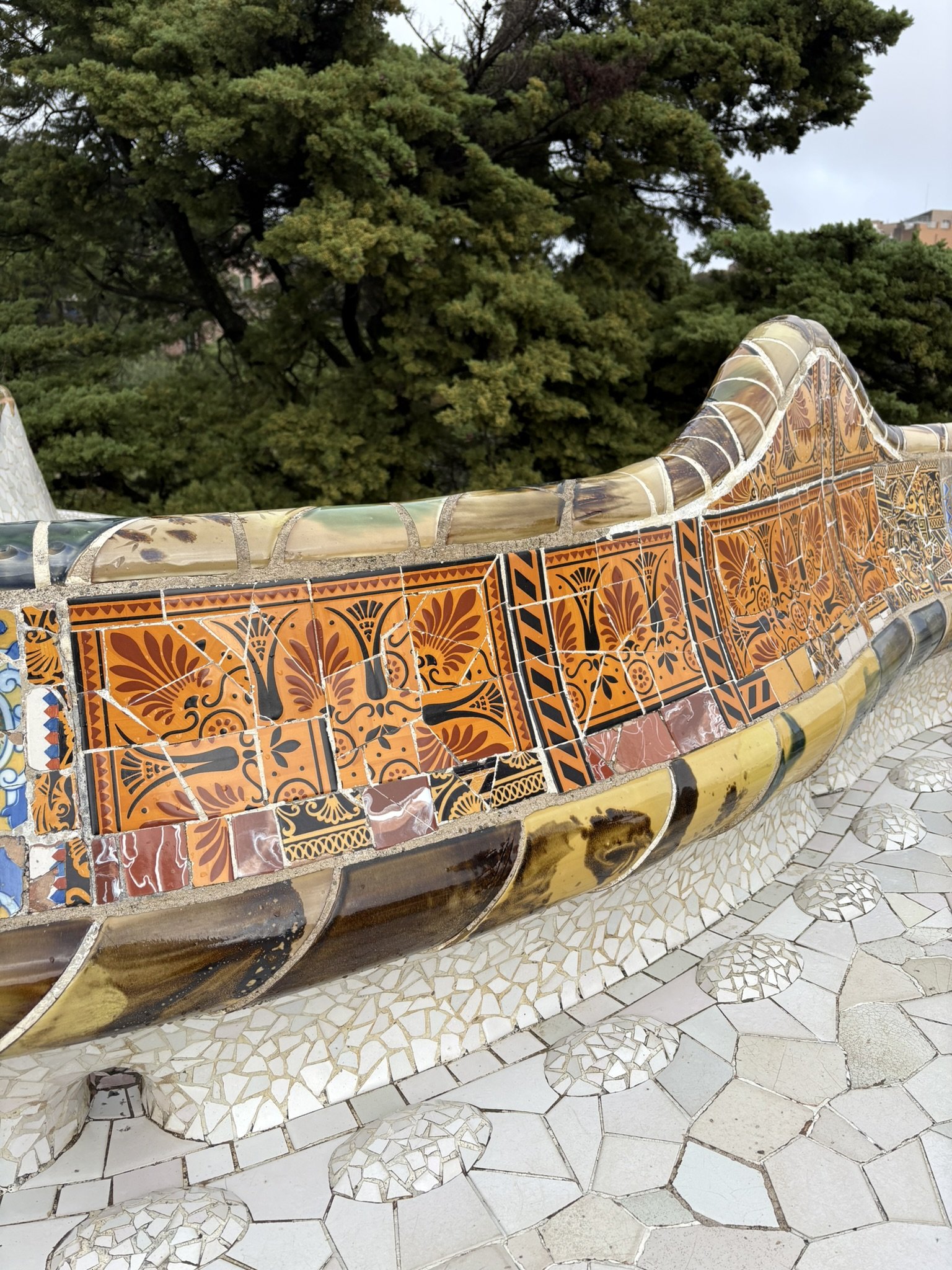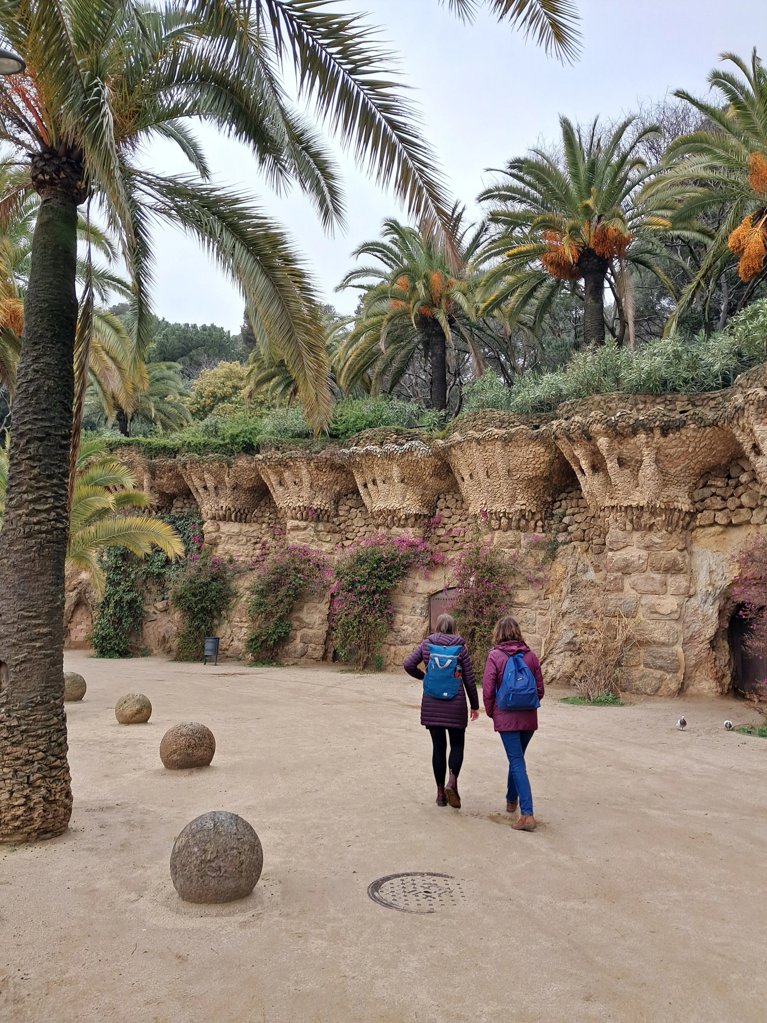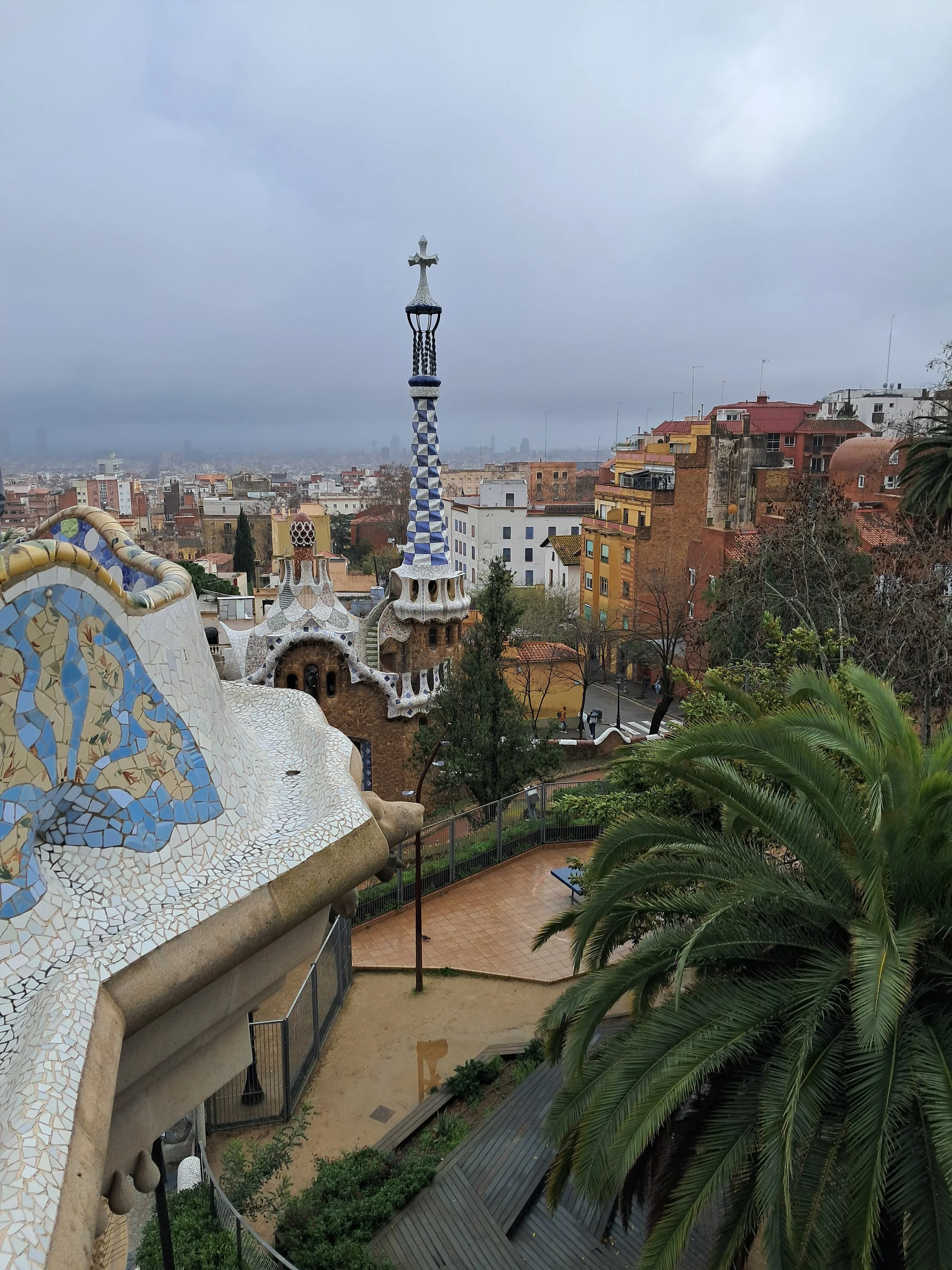 As the weather started to clear, Barcelona showed us a brighter side. We took a walk through Park Güell. The gardens were just waking up from winter, with flowers showing small bursts of colour. The winding benches, playful buildings, and Gaudí’s famous colourful ceramic mosaics brought joy, even under a cloudy sky.